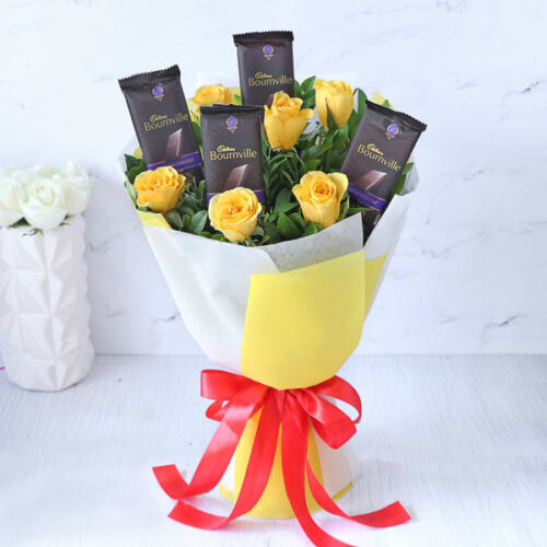 Roses with Chocolates will have your dearest hooked on to your love. This unique bouquet of 6 lively yellow roses and 4 delicious Cadbury Bournville will keep their faith alive in your affection. Key attributes :