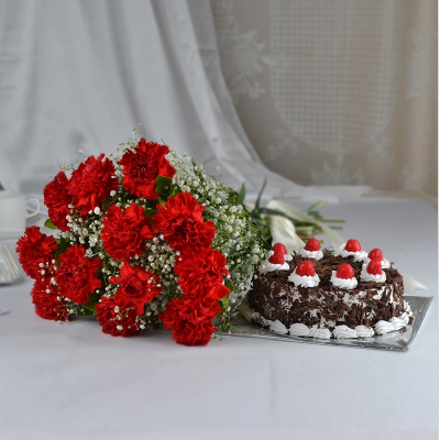 Celebrate the victory of your son with these 12 red carnations flowers and cut the cake to cheer the victory. The icing done on the cake with chocolate flakes and cherries makes it look good and delicious to eat. The soft and spongy taste of the cake will blow the mind of everyone and will take the celebration to another level. The beautiful red carnation flowers will cheer him up for the next bigger competitions and will motivate him to do better. Product Details: Bunch of 12 Red Carnations with matching bow tied, Half kg round shape black forest cake
