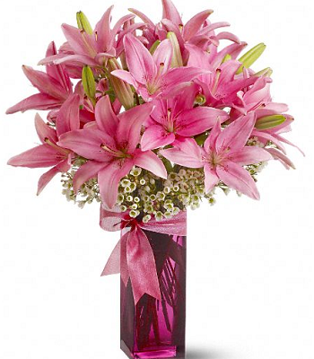 This beautiful bouquet of pink lilies and purple orchids is just a perfect gift to someone who is near and dear to you. This unique bouquet will make the person feel special. There are 10 pink lilies and five purple orchids in a round arrangement basket. This makes for a graet gift for birthdays, wedding anniversaries etc. Product Details: 10 Pink Lilies, 5 Purple Orchids in a Round Arrangement Basket Product packing: Round Arrangement Basket