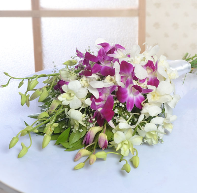 You can gift it to your loved ones on special occasions like wedding anniversary, Valentine Day, house warming and so on to show admiration and love towards them. Nothing would be a better and more heart touching than this regal bunch of orchids on any special occasion. So get going and book your order now. Product Details: Bunch of 3 White and 3 Purple Orchids