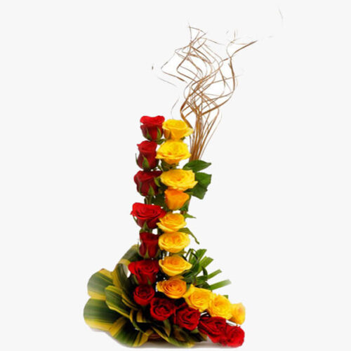 This bouquet of red and yellow roses is a perfect way to express how you feel, be it love, sorrow, care, or affection. the freshest roses, arranged charmingly in a unique style, with green fillers and dry sticks will definitely bring comfort and smile to your loved ones.