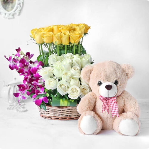 Teddies are those cuddle bears you cannot stay without and when they come with a basket of exotic flowers like Yellow and White Roses with Purple Orchids, the combo becomes instantly more blissful. Give this to the one in need of a little cheerfulness!